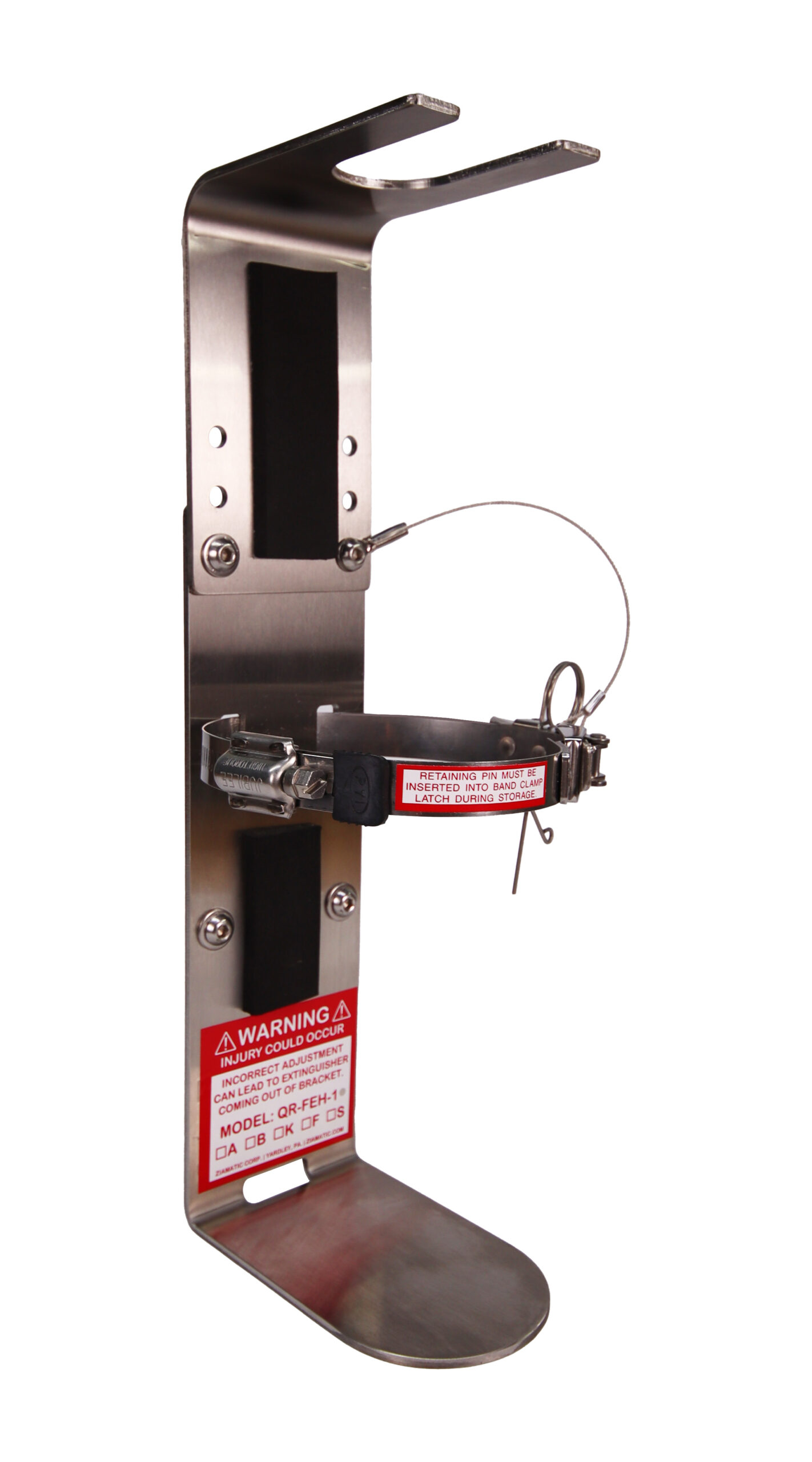 Model QR-FEH-1: Fits most makes and models of fire extinguishers and is adjustable to 3 overall heights: 12.25”, 13”, or 13.75”